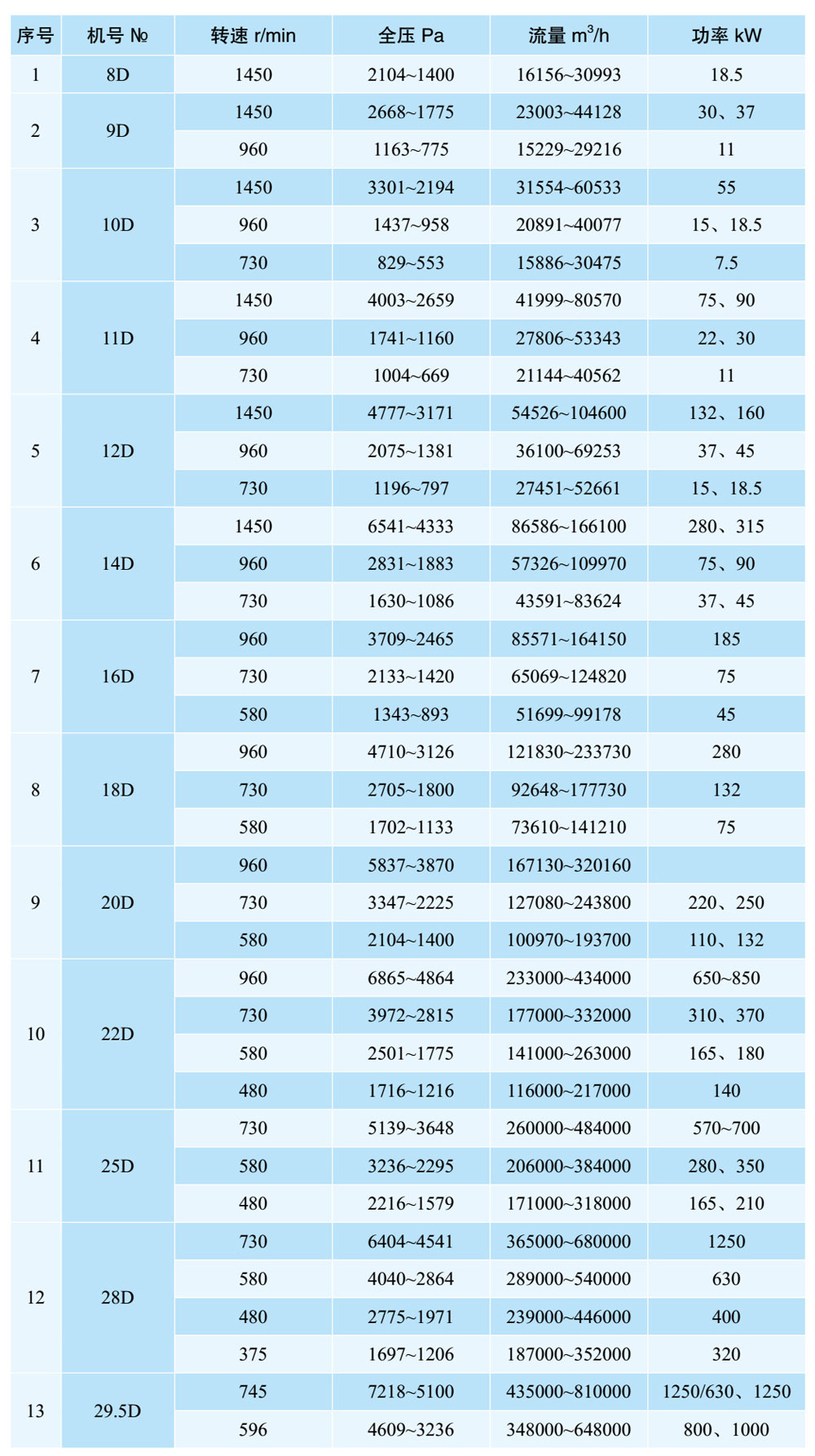 1、本風機制成單吸入,機號有№4、№5、№5.6、№6.3、№7.1、№8、№9、№10、№11.2、№12.5、№14、№16十三個機號。